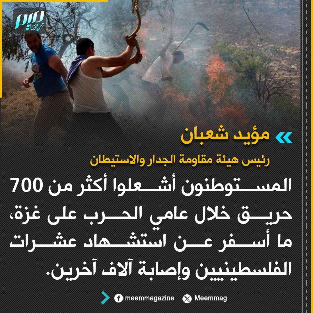 رئيس هيئة مقاومة الجدار والاستيطان: المستوطنون أشعلوا أكثر من 700 حريق خلال عامي الحرب على غزة، ما أسفر عن استشهاد عشرات الفلسطينيين وإصابة آلاف آخرين.
