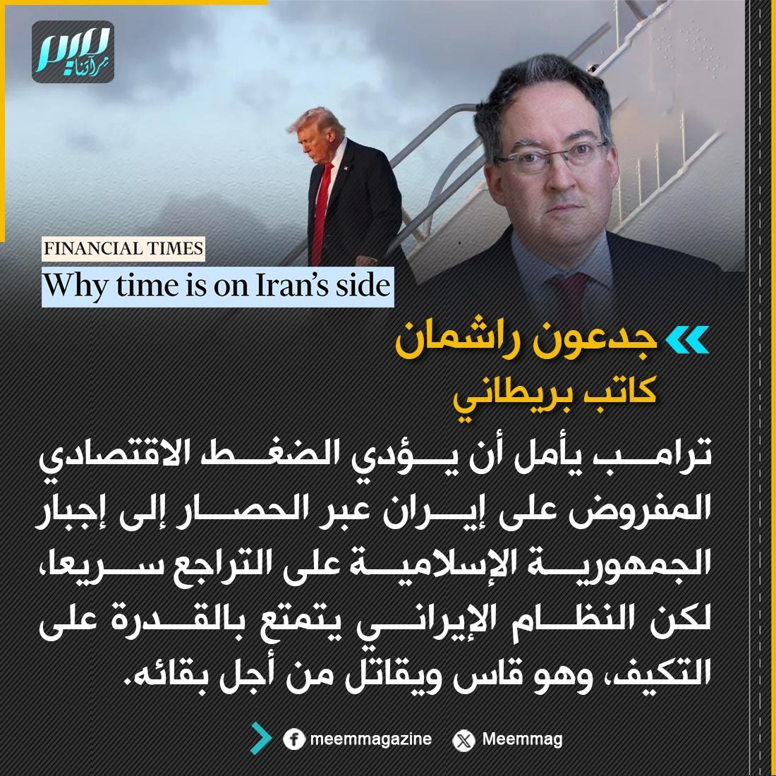 الكاتب البريطاني جدعون راشمان: ترامب يأمل أن يؤدي الضغط الاقتصادي المفروض على إيران عبر الحصار إلى إجبار الجمهورية الإسلامية على التراجع سريعا، لكن النظام الإيراني يتمتع بالقدرة على التكيف، وهو قاس ويقاتل من أجل بقائه.
