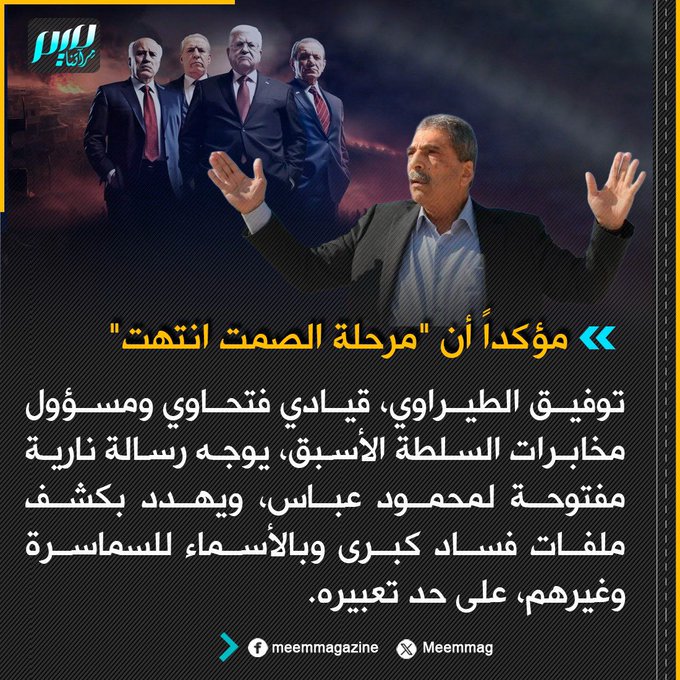 توفيق الطيراوي، قيادي فتحاوي ومسؤول مخابرات السلطة الأسبق، يوجه رسالة نارية مفتوحة لمحمود عباس، ويهدد بكشف ملفات فساد كبرى وبالأسماء للسماسرة وغيرهم، على حد تعبيره.