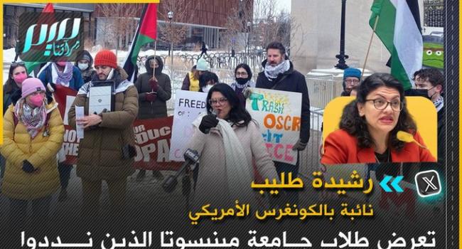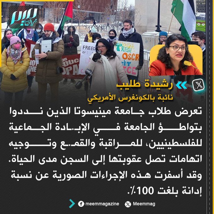 النائبة الفلسطينية بالكونغرس الأمريكي رشيدة طليب: لقد تعرض طلاب جامعة مينيسوتا الذين نددوا بتواطؤ الجامعة في الإبـ.ـادة الجماعية للفلسطينيين، للمراقبة والقـمـ.ـع وتوجيه اتهامات تصل عقوبتها إلى السجن مدى الحياة.