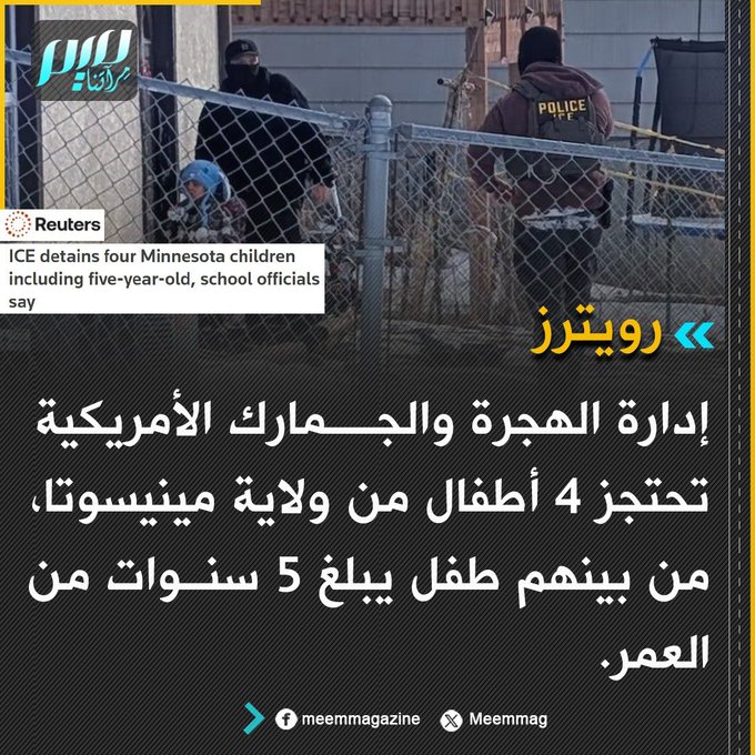رويترز: إدارة الهجرة والجمارك الأمريكية تحتجز 4 أطفال من ولاية مينيسوتا، من بينهم طفل يبلغ 5 سنوات من العمر.