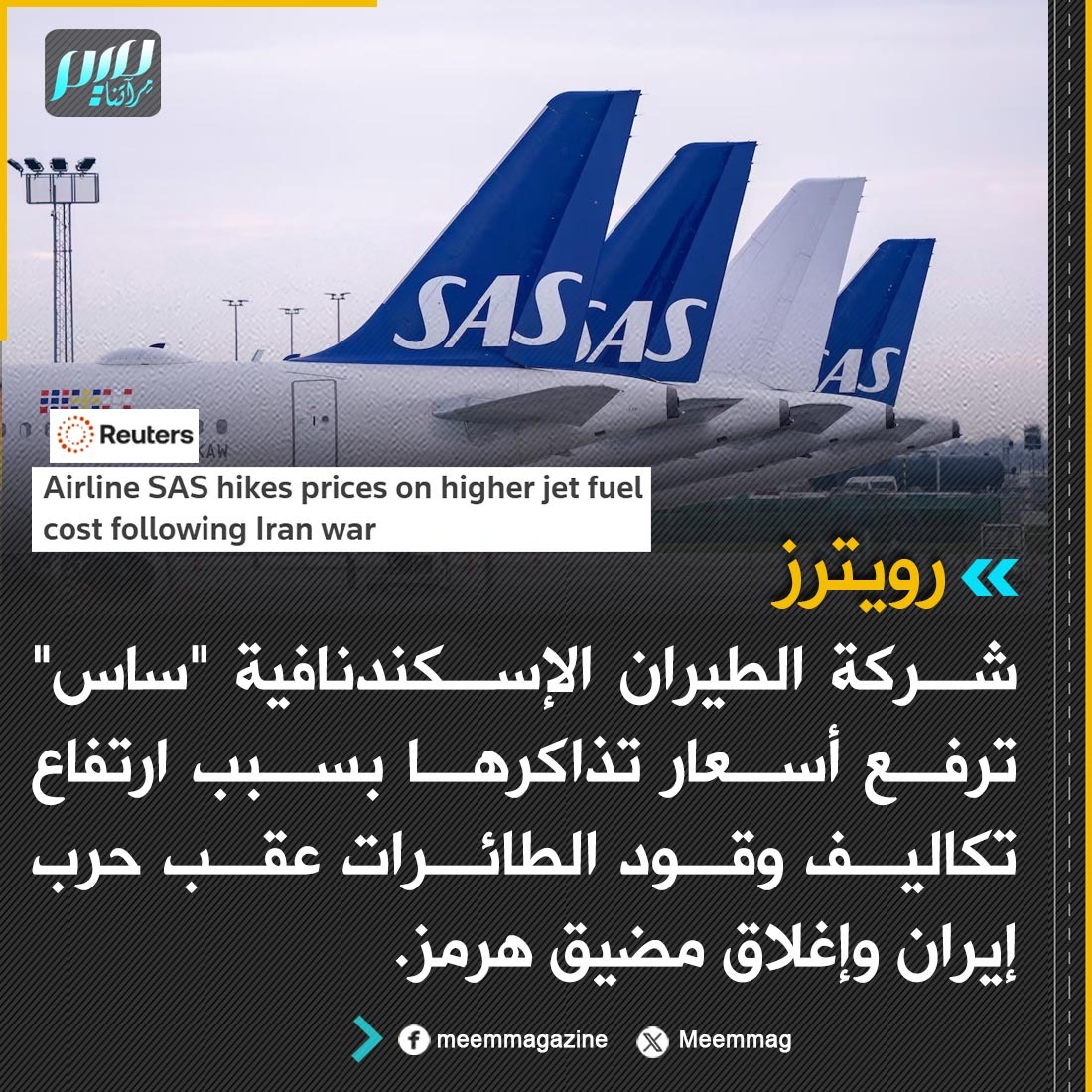 رويترز: شركة الطيران الإسكندنافية "ساس" ترفع أسعار تذاكرها بسبب ارتفاع تكاليف وقود الطائرات عقب حرب إيران وإغلاق مضيق هرمز.