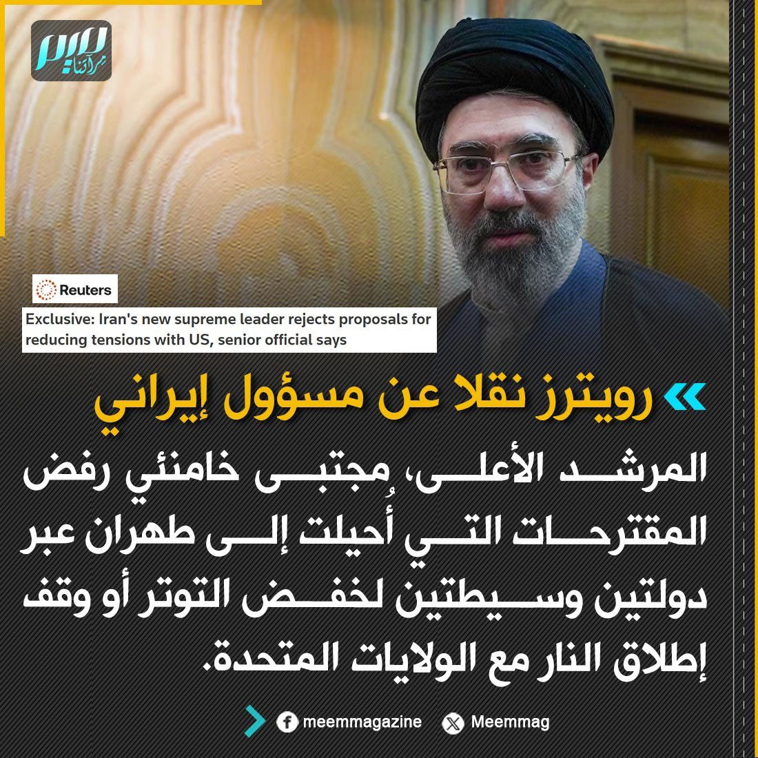رويترز نقلا عن مسؤول إيراني: المرشد الأعلى، مجتبى خامنئي رفض المقترحات التي أُحيلت إلى طهران