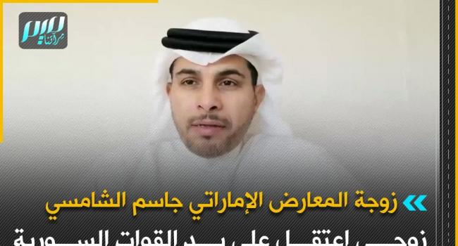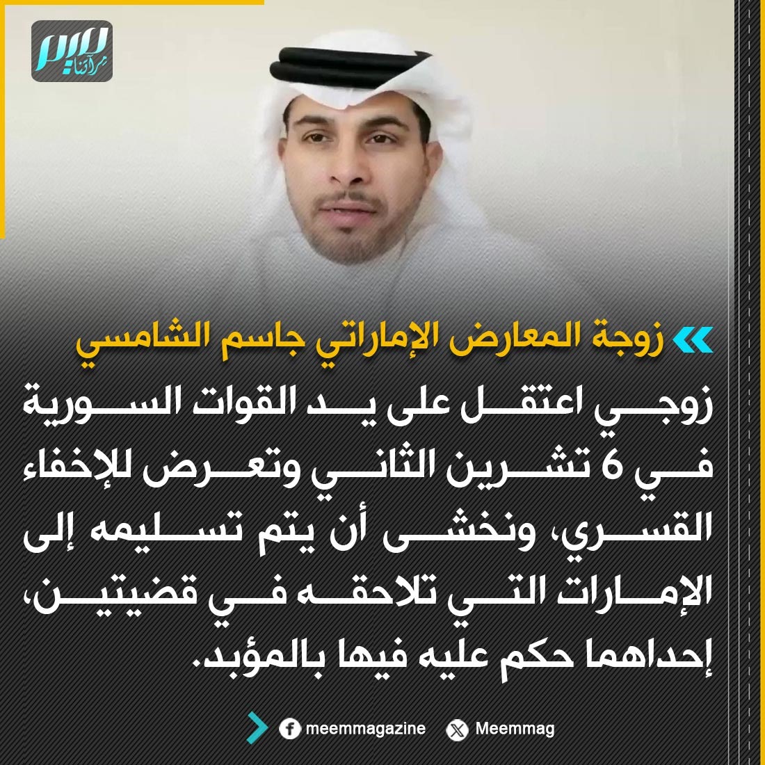 زوجة المعارض الإماراتي جاسم الشامسي: زوجي اعتُقل على يد القوات السورية في 6 تشرين الثاني وتعرض للإخفاء القسري، ونخشى أن يتم تسليمه إلى الإمارات التي تلاحقه في قضيتين، إحداهما حكم عليه فيها بالمؤبد.