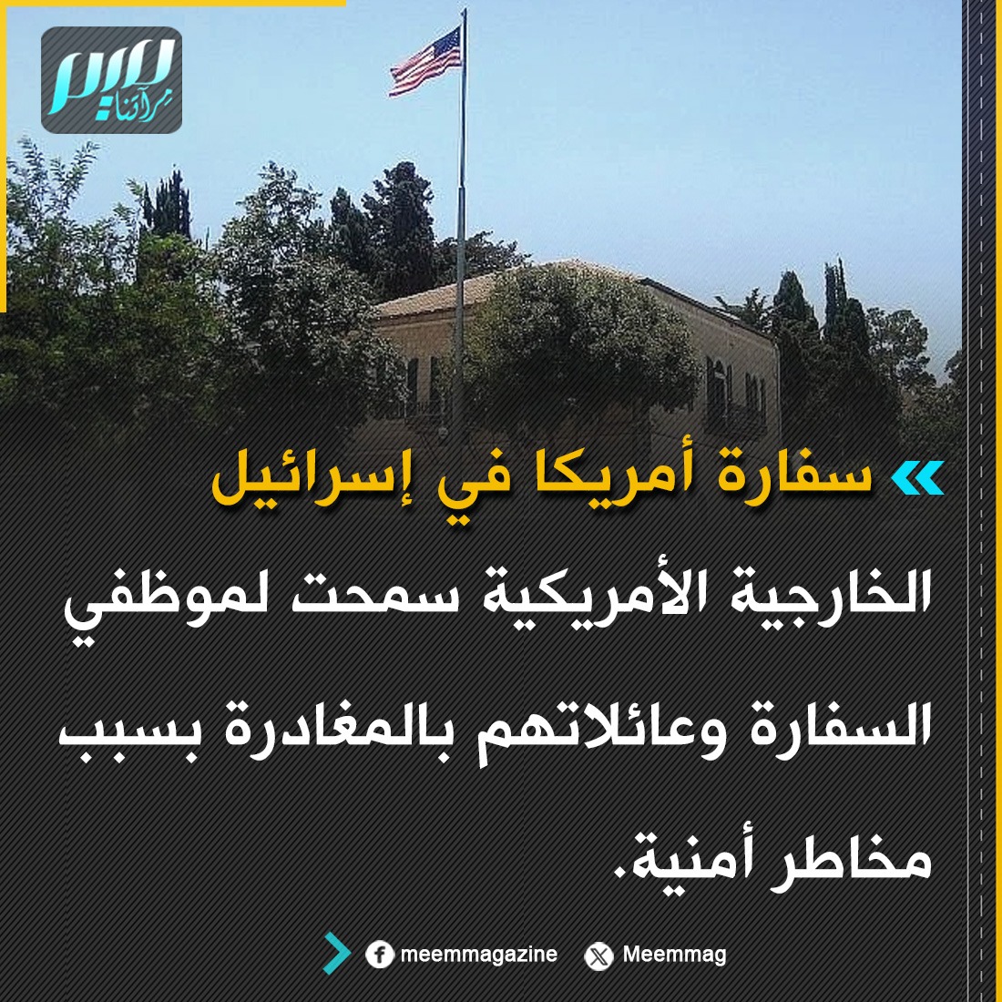 سفارة أمريكا في إسرائيل: الخارجية الأمريكية سمحت لموظفي السفارة وعائلاتهم بالمغادرة بسبب مخاطر أمنية.