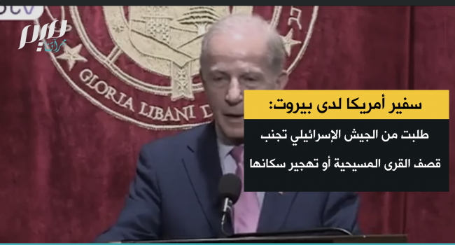 السفير الأمريكي لدى بيروت ميشال عيسى في تصريح صادم: طلبت من الجيش الإسرائيلي عدم قصف القرى المسيحية في جنوب لبنان أو تهجير سكانها. نشطاء اعتبروا هذا التصريح بأنه مشاركة في حملة تطهير عرقي تستهدف الشيعة.
