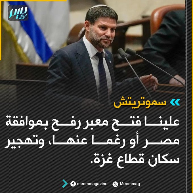 سموتريتش: علينا فتح معبر رفح بموافقة مصر أو رغما عنها، وتهجير سكان قطاع غزة.