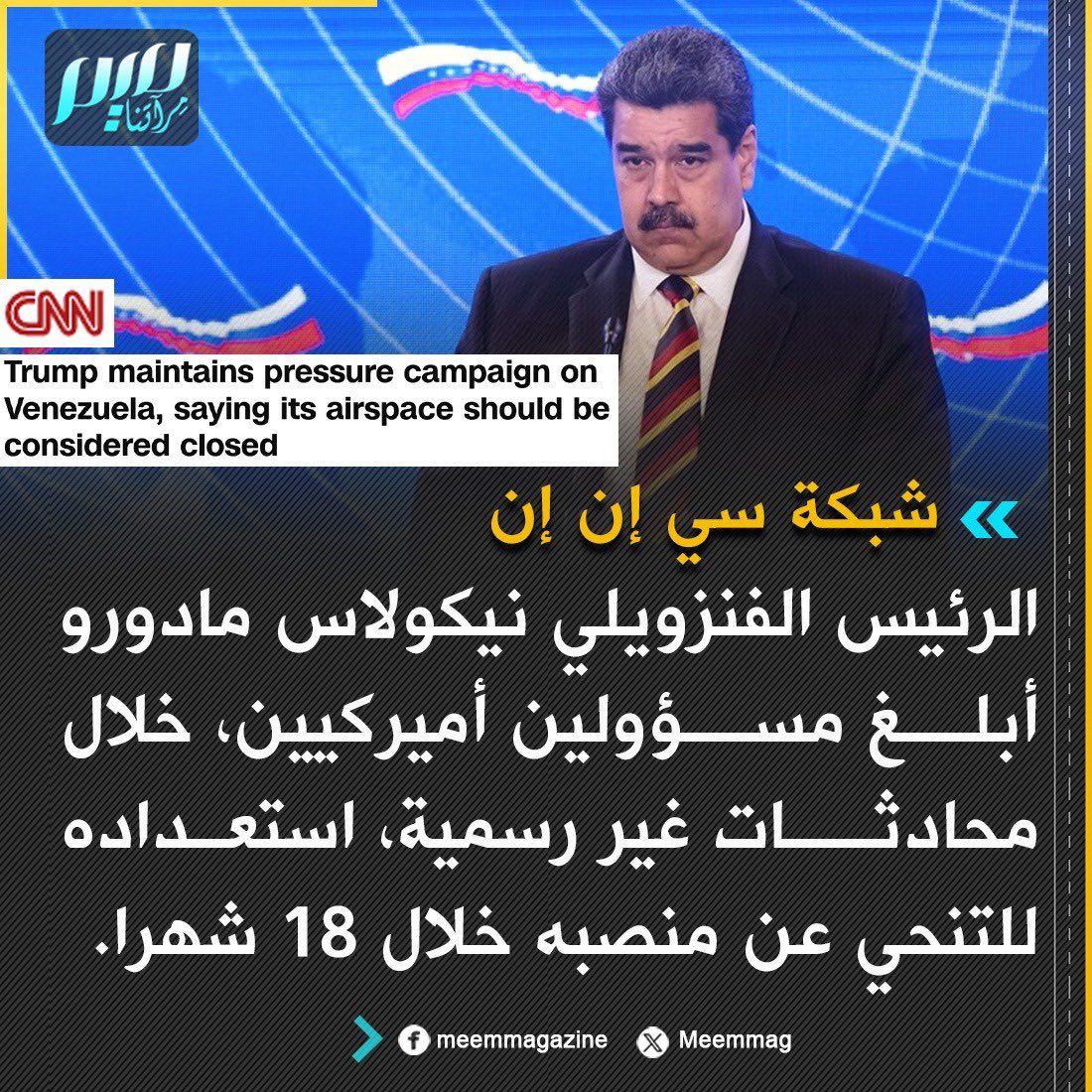 شبكة سي إن إن: الرئيس الفنزويلي نيكولاس مادورو أبلغ مسؤولين أميركيين، خلال محادثات غير رسمية، استعداده للتنحي عن منصبه خلال 18 شهرا.