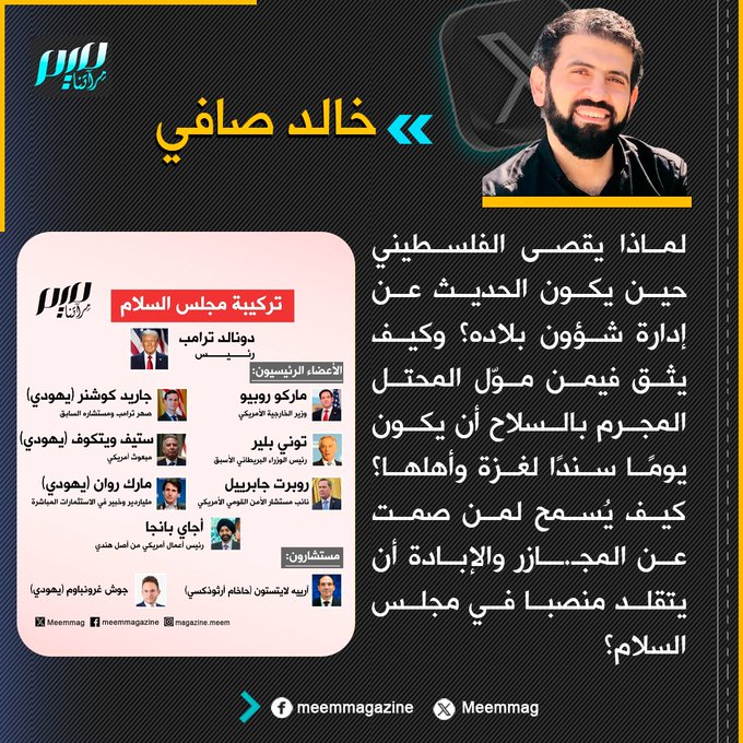 صافي: لماذا يُقصى الفلسطيني عن إدارة شؤون بلاده؟ وكيف يثق فيمن موّل المحتل المجرم بالسلاح أن يكون يومًا سندًا لغزة وأهلها؟ كيف يُسمح لمن صمت عن المجـ.ـازر والإبادة أن يتقلد منصبا في مجلس السلام؟