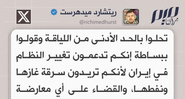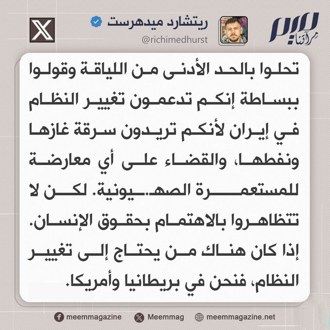 صحفي بريطاني: تحلوا بالحد الأدنى من اللياقة وقولوا ببساطة إنكم تدعمون تغيير النظام في إيران لأنكم تريدون سرقة غازها ونفطها، والقضاء على أي معارضة للمستعمرة الصـ.ـهيونية.