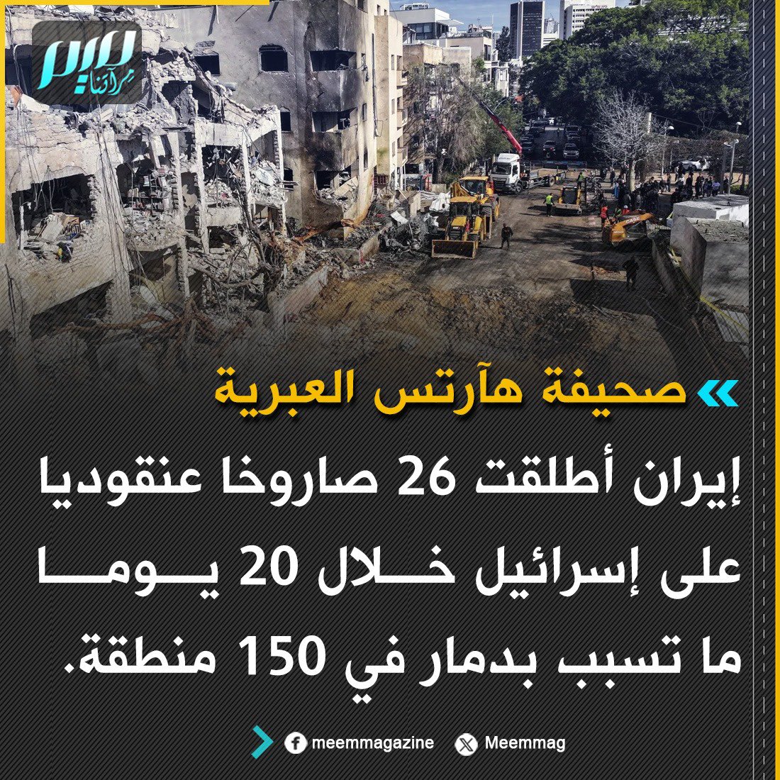 صحيفة هآرتس العبرية: إيران أطلقت 26 صاروخا عنقوديا على إسرائيل خلال 20 يوما ما تسبب بدمار في 150 منطقة.