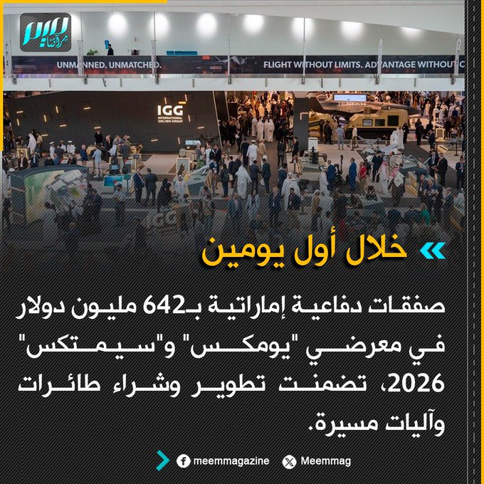 خلال أول يومين.. صفقات دفاعية إماراتية بـ642 مليون دولار في معرضي "يومكس" و"سيمتكس" 2026، تضمنت تطوير وشراء طائرات وآليات مسيرة.