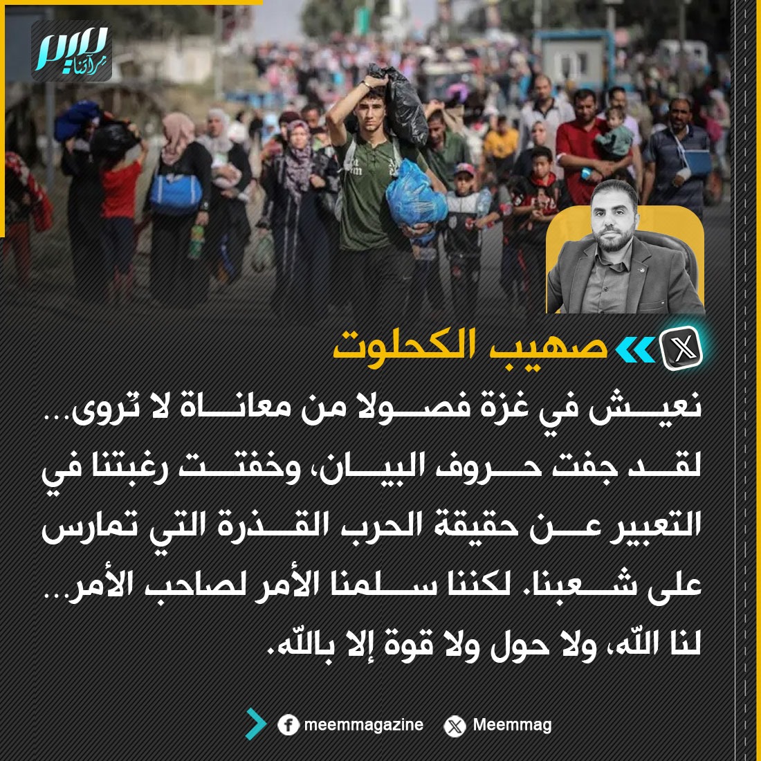 صهيب الكحلوت: نعيش في غزة فصولا من معاناة لا تُروى… لقد جفت حروف البيان، وخفتت رغبتنا في التعبير عن حقيقة الحرب القذرة التي تمارس على شعبنا.