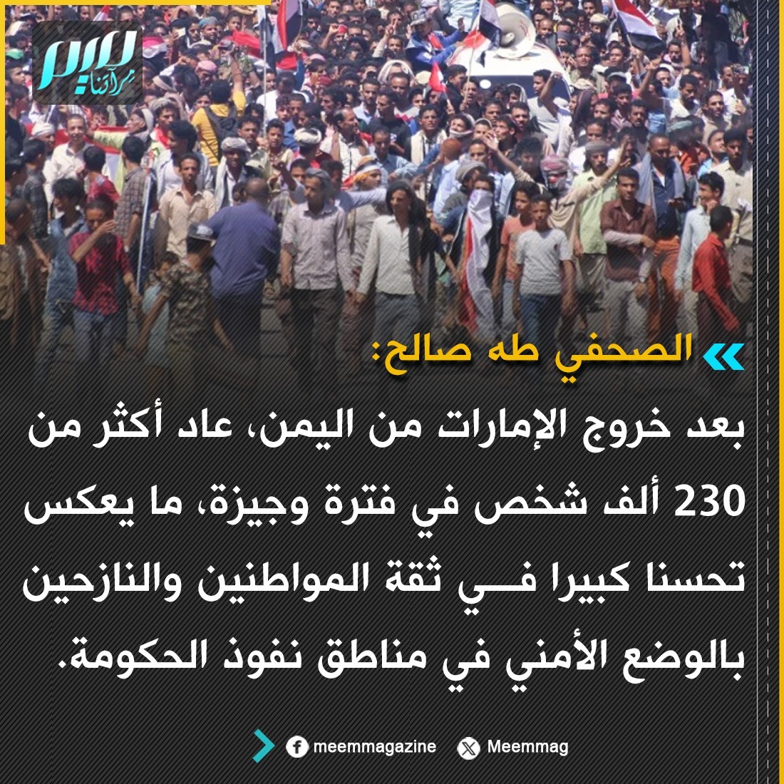 الصحفي طه صالح: بعد خروج الإمارات من اليمن، عاد أكثر من 230 ألف شخص في فترة وجيزة، ما يعكس تحسنا كبيرا في ثقة المواطنين والنازحين بالوضع الأمني في مناطق نفوذ الحكومة.