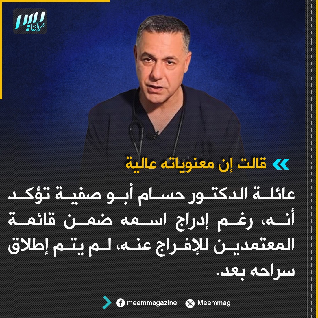 عائلة الدكتور حسام أبو صفية تؤكد أنه، رغم إدراج اسمه ضمن قائمة المعتمدين للإفراج عنه، لم يتم إطلاق سراحه بعد.