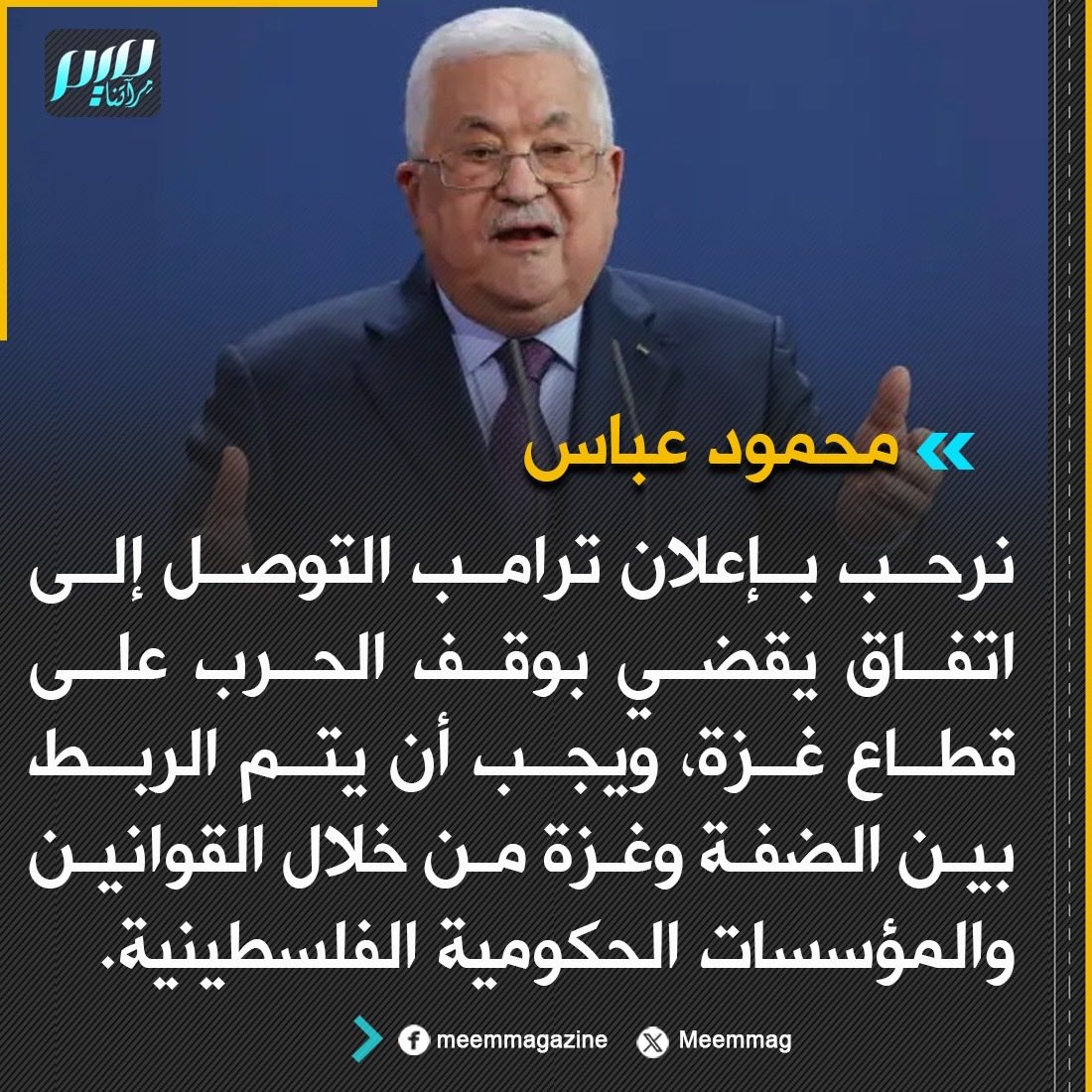 عباس: نرحب بإعلان ترامب التوصل إلى اتفاق يقضي بوقف الحرب على قطاع غزة، ويجب أن يتم الربط بين الضفة وغزة من خلال القوانين والمؤسسات الحكومية الفلسطينية.