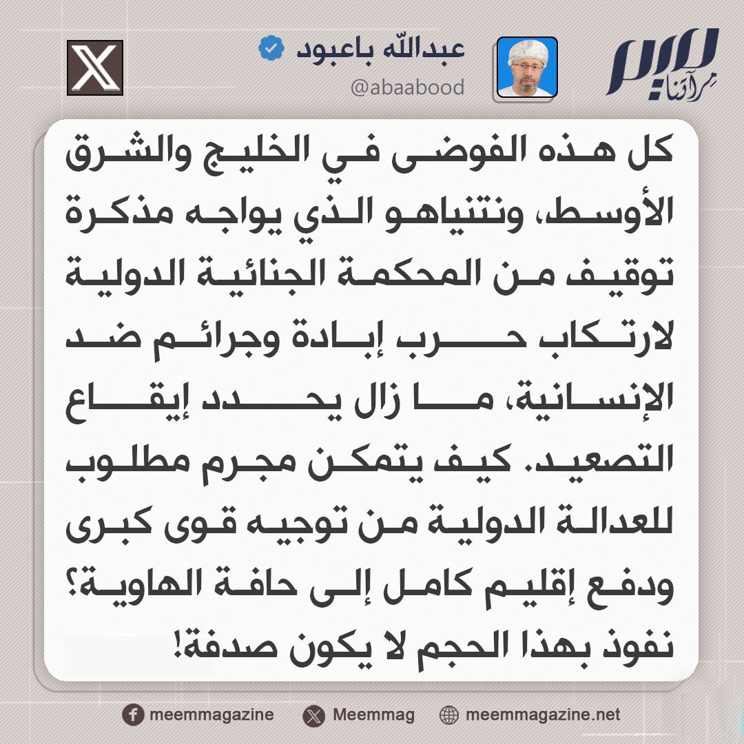 عبد الله باعبود: كل هذه الفوضى في الخليج والشرق الأوسط، ونتنياهو الذي يواجه مذكرة توقيف من المحكمة الجنائية الدولية لارتكاب حرب إبادة وجرائم ضد الإنسانية، ما زال يحدد إيقاع التصعيد.