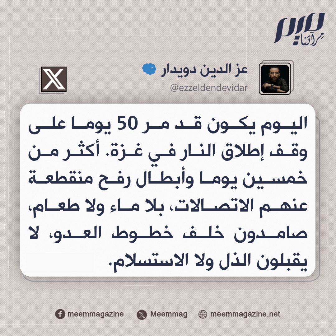 عز الدين دويدار: اليوم يكون قد مر 50 يوما على وقف إطلاق النار في غزة. أكثر من خمسين يوما وأبطال رفح منقطعة عنهم الاتصالات، بلا ماء ولا طعام، صامدون خلف خطوط العدو، لا يقبلون الذل ولا الاستسلام.