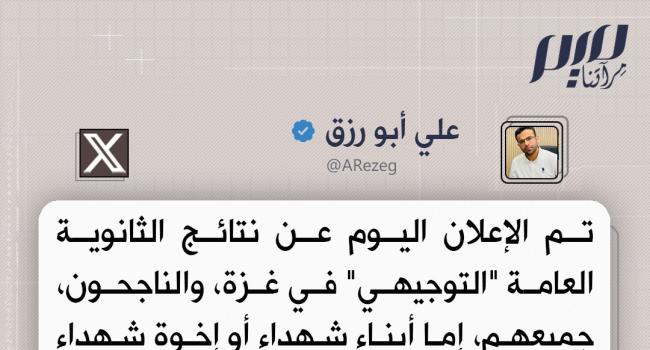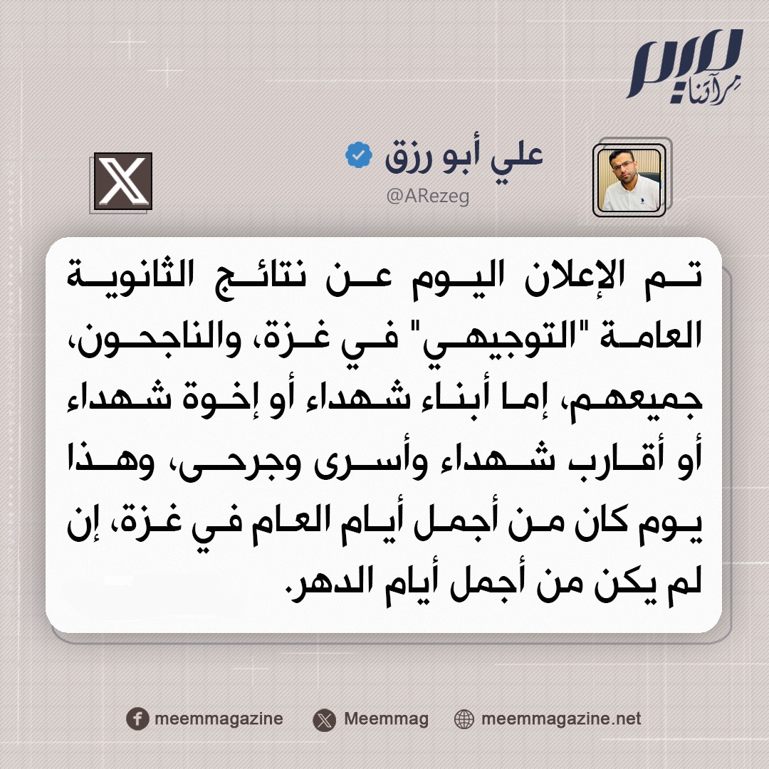 علي أبورزق: تم الإعلان اليوم عن نتائج الثانوية العامة "التوجيهي" في غزة، والناجحون، جميعهم، إما أبناء شهداء أو إخوة شهداء أو أقارب شهداء وأسرى وجرحى، وهذا يوم كان من أجمل أيام العام في غزة، إن لم يكن من أجمل أيام الدهر.