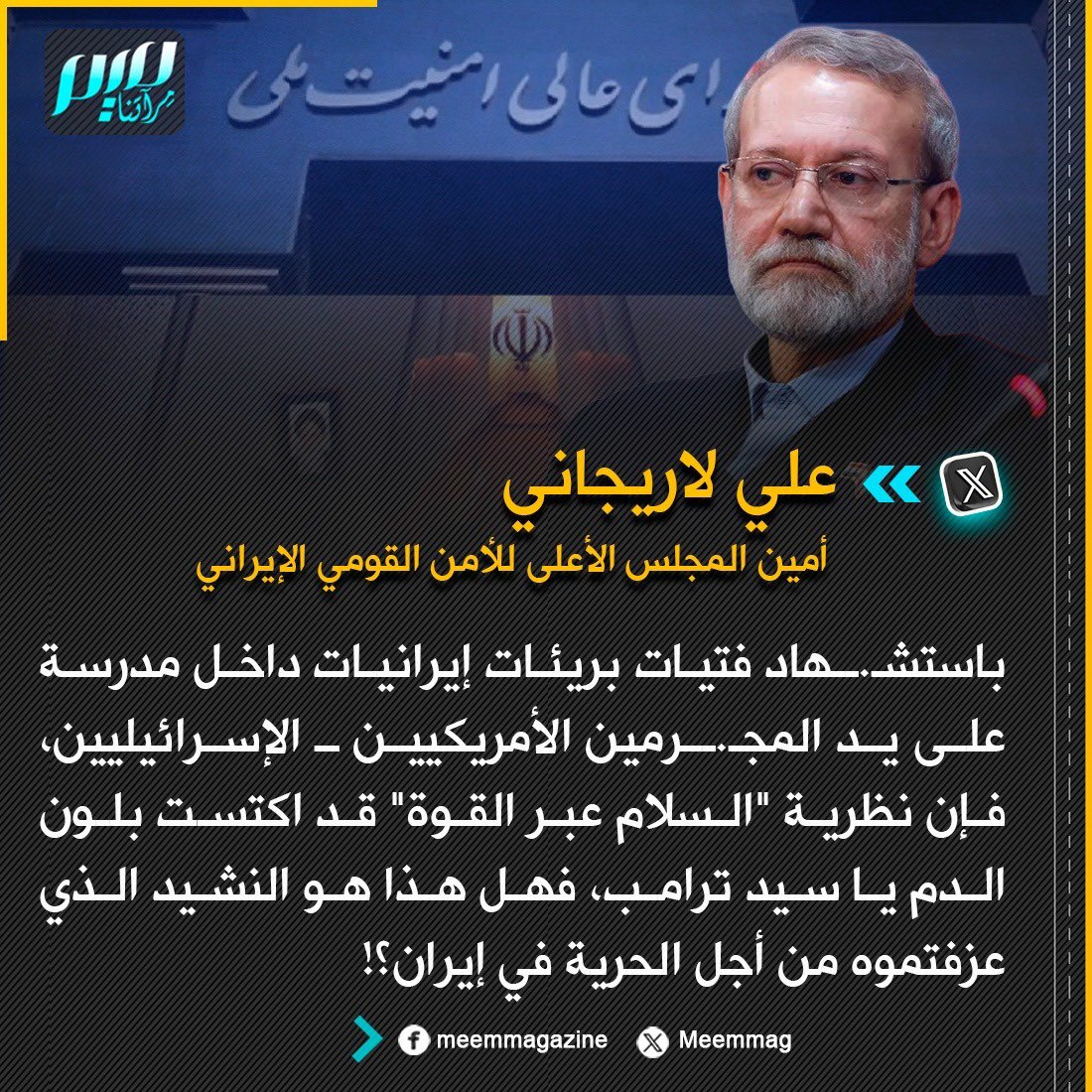 علي لاريجاني: باستشهاد فتيات بريئات إيرانيات داخل مدرسة على يد المجرمين الأمريكيين ـ الإسرائيليين، فإن نظرية "السلام عبر القوة" قد اكتست بلون الدم يا سيد ترامب!