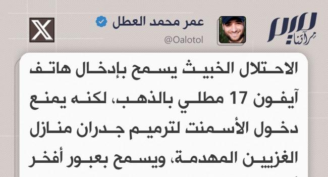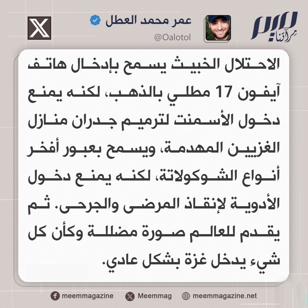 عمر العطل: الاحتلال الخبيث يسمح بإدخال آيفون 17 مطلي بالذهب، لكنه يمنع دخول الأسمنت لترميم جدران منازل الغزيين المهدمة، ويسمح بعبور أفخر أنواع الشوكولاتة، لكنه يمنع دخول الأدوية لإنقاذ المرضى والجرحى.
