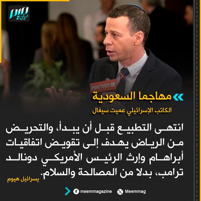 الكاتب الإسرائيلي عميت سيغال: انتهى التطبيع مع السعودية قبل أن يبدأ، والتحريض من الرياض يهدف إلى تقويض اتفاقيات أبراهام وإرث الرئيس الأمريكي دونالد ترامب، بدلا من المصالحة والسلام.
