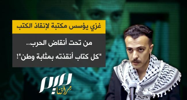 مؤسس مكتبة العنقاء، عمر حمد يجمّع الكتب الناجية من الإبادة والحرب التي يشنها الاحتلال لمحو الثقافة الفلسطينية: كل كتابٍ حملته على كتفي في رحلة النزوح، كل كتابٍ أنقذته من تحت الأنقاض، كان بمثابة وطنٍ مسلوب، وطنٍ مُزّقت صفحاته، لكن الأمل في استعادته يبقى حيًّا فينا ما دمنا أحياء."