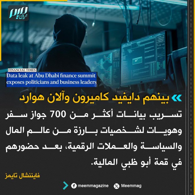فايننشال تايمز: تسريب بيانات أكثر من 700 جواز سفر وهويات لشخصيات بارزة من عالم المال والسياسة والعملات الرقمية للخطر، بعد حضورهم في قمة أبو ظبي المالية.