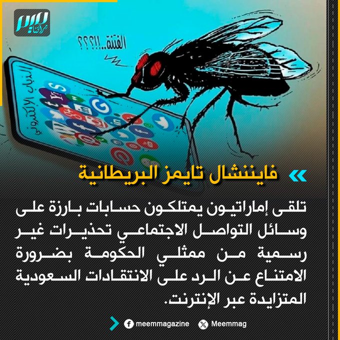 فايننشال تايمز: تلقى إماراتيون يمتلكون حسابات بارزة على وسائل التواصل الاجتماعي تحذيرات غير رسمية من ممثلي الحكومة بضرورة الامتناع عن الرد على الانتقادات السعودية المتزايدة عبر الإنترنت.