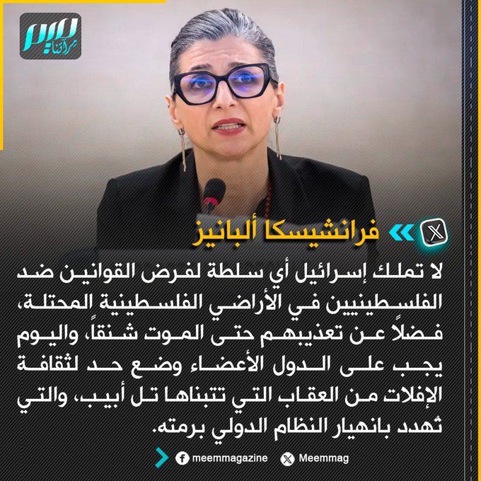 فرانشيسكا ألبانيز: لا تملك إسرائيل أي سلطة لفرض القوانين ضد الفلسطينيين في الأراضي الفلسطينية المحتلة، فضلاً عن تعذيبهم حتى الموت شنـ ـقاً، واليوم يجب على الدول الأعضاء وضع حد لثقافة الإفلات من العقاب التي تتبناها تل أبيب، والتي تُهدد بانهيار النظام الدولي برمته.