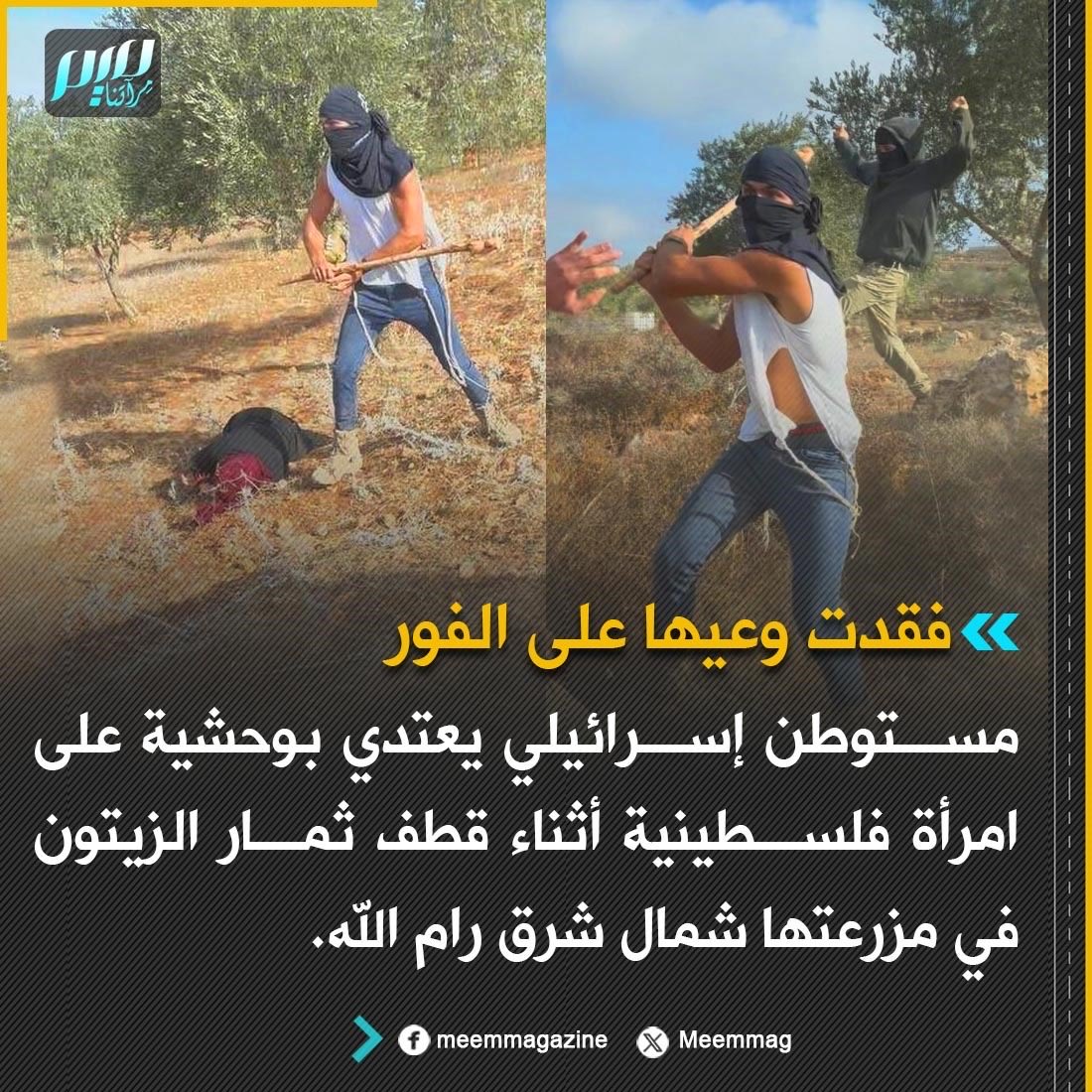 فقدت وعيها على الفور: مستوطن إسرائيلي يعتدي بوحشية على امرأة فلسطينية أثناء قطف ثمار الزيتون في مزرعتها شمال شرق رام الله.