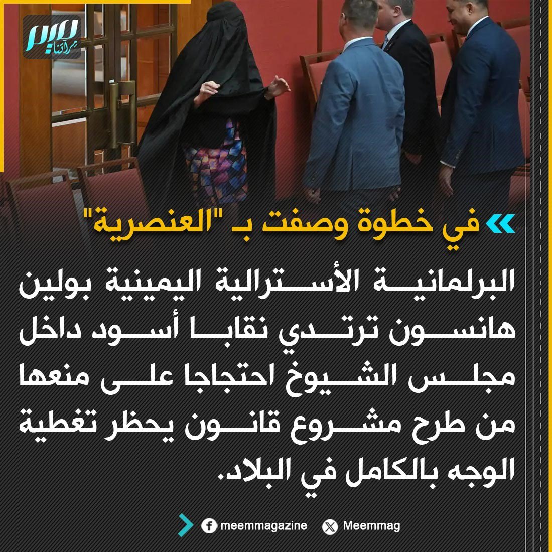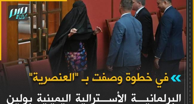 في خطوة وصفت بـ "العنصرية".. البرلمانية الأسترالية اليمينية بولين هانسون ترتدي نقابا أسود داخل مجلس الشيوخ احتجاجا على منعها من طرح مشروع قانون يحظر تغطية الوجه بالكامل في البلاد.