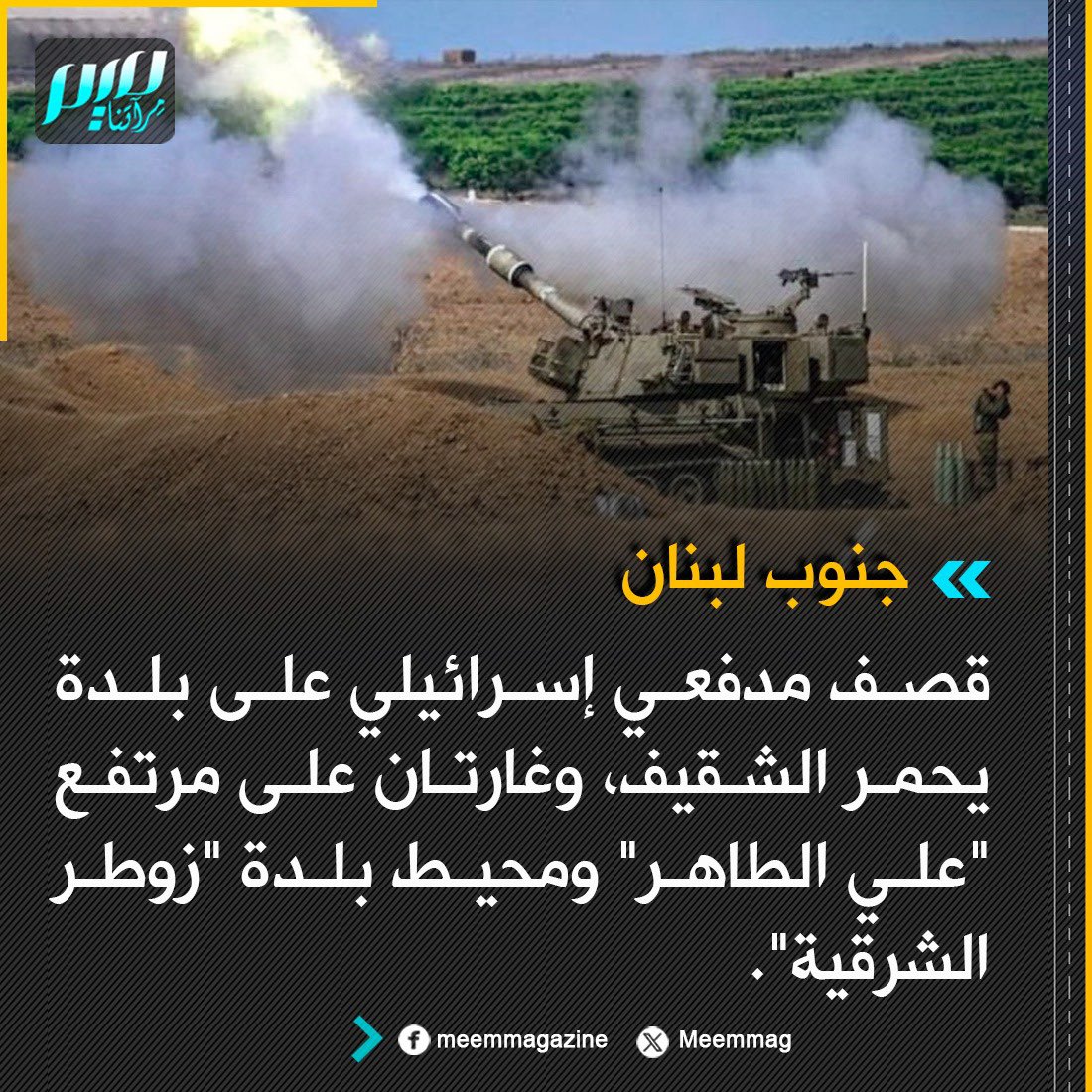 قصف مدفعي إسرائيلي على بلدة يحمر الشقيف، وغارتان على مرتفع "علي الطاهر" ومحيط بلدة "زوطر الشرقية" في جنوب لبنان.