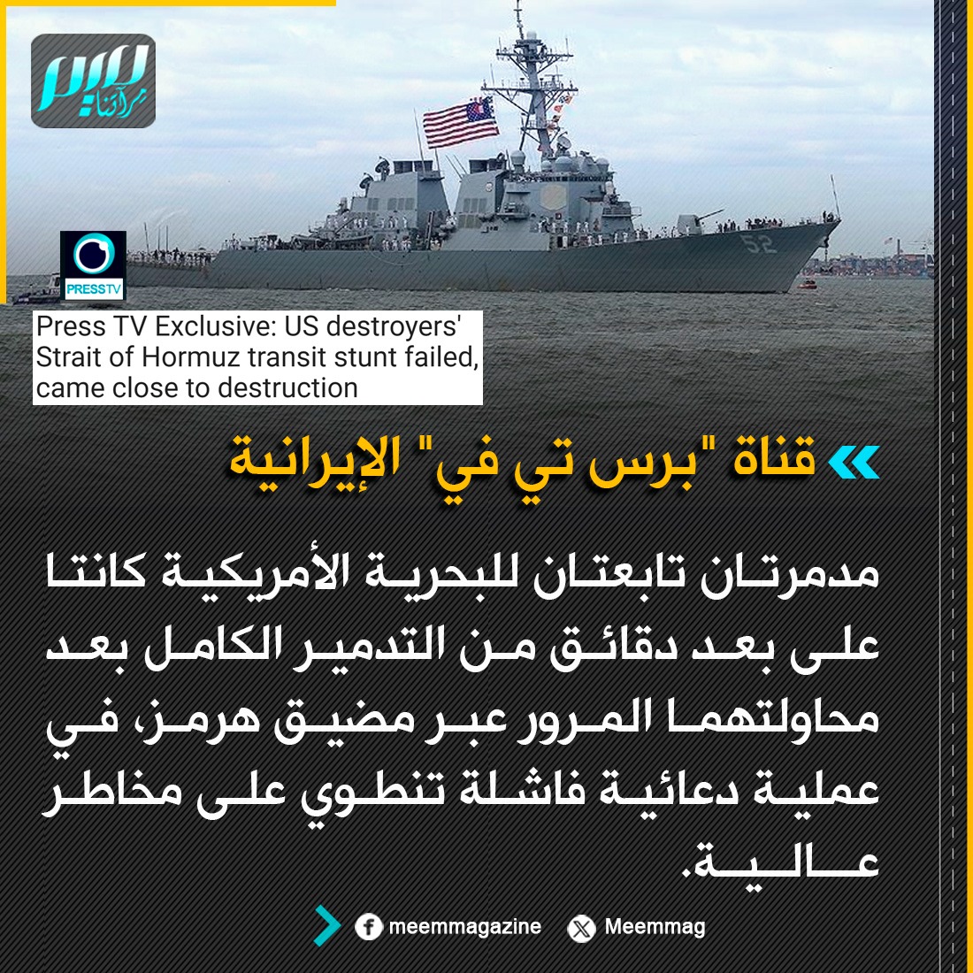 قناة "برس تي في" الإيرانية: مدمرتان تابعتان للبحرية الأمريكية كانتا على بعد دقائق من التدمير الكامل بعد محاولتهما المرور عبر مضيق هرمز.