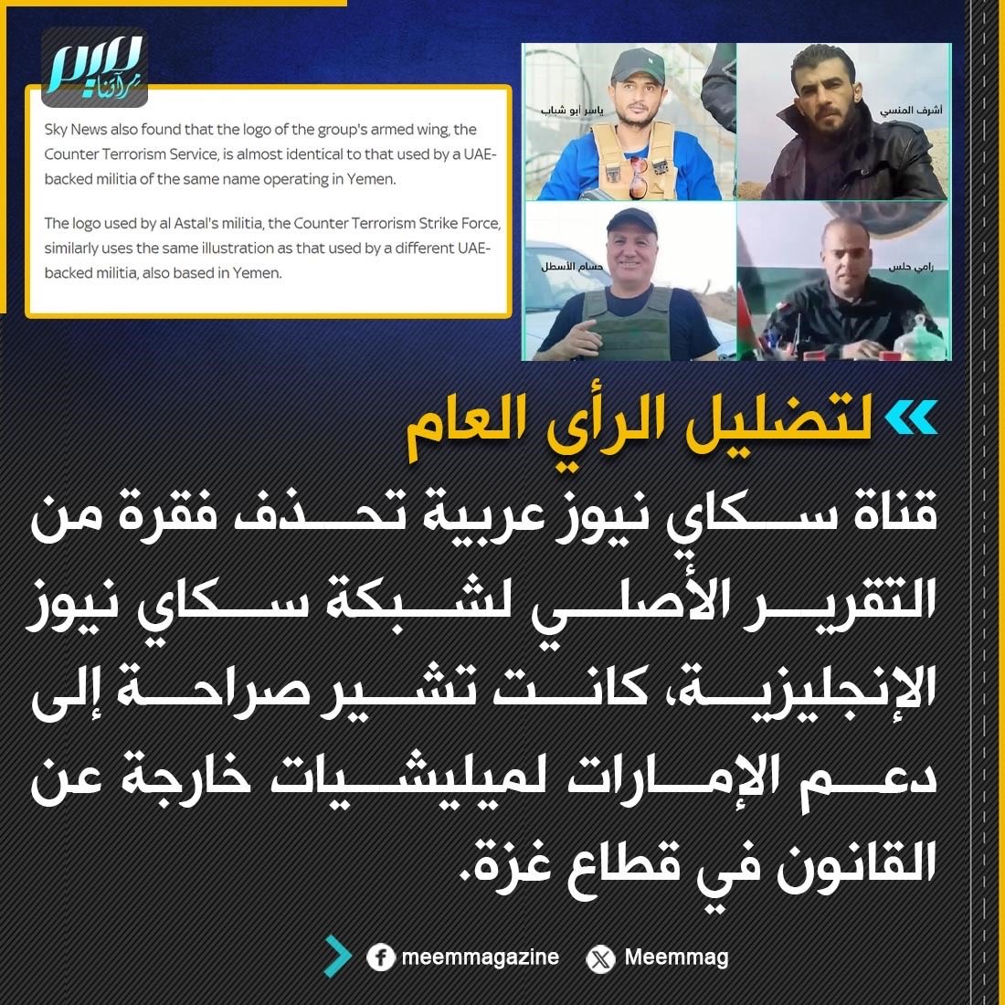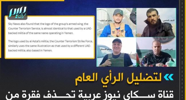 لتضليل الرأي العام: قناة سكاي نيوز عربية تحذف فقرة من التقرير الأصلي لشبكة سكاي نيوز الإنجليزية، كانت تشير صراحة إلى دعم الإمارات لميليشيات خارجة عن القانون في قطاع غزة.