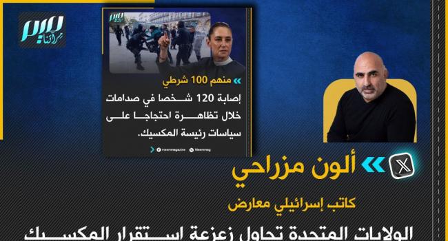 كاتب إسرائيلي معارض: الولايات المتحدة تحاول زعزعة استقرار المكسيك التي تشهد نموًا جيدًا، وانخفاضًا في معدلات الجريمة، وتنمية شاملة، وقد ذكر ترامب المكسيك كمشكلة مؤخرًا، وهنا يجب على شعوب العالم أن تفعل شيئًا حيال الولايات المتحدة الخارجة عن القانون والمتحاربة.