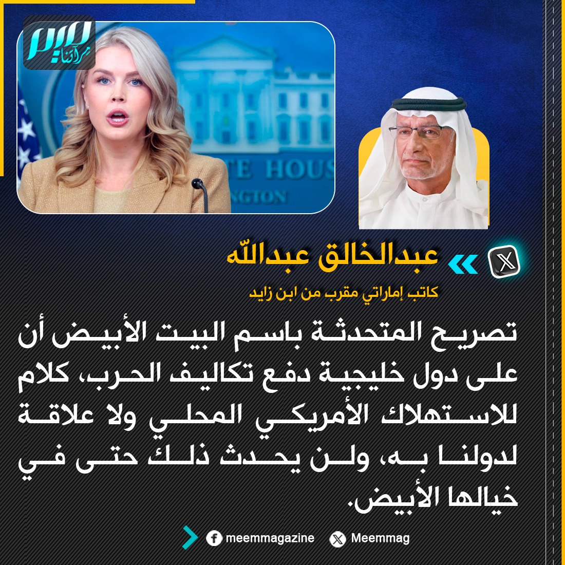 كاتب إماراتي: تصريح المتحدثة باسم البيت الأبيض أن على دول خليجية دفع تكاليف الحرب، كلام للاستهلاك الأمريكي المحلي ولا علاقة لدولنا به، ولن يحدث ذلك حتى في خيالها الأبيض.