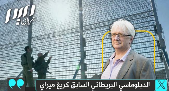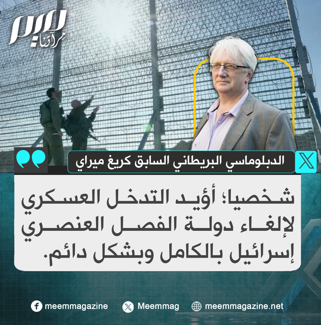 الدبلوماسي البريطاني السابق كريغ ميراي: شخصيا؛ أؤيد التدخل العسكري لإلغاء دولة الفـ ـصل العنـ ـصري إسرائيل بالكامل وبشكل دائم.