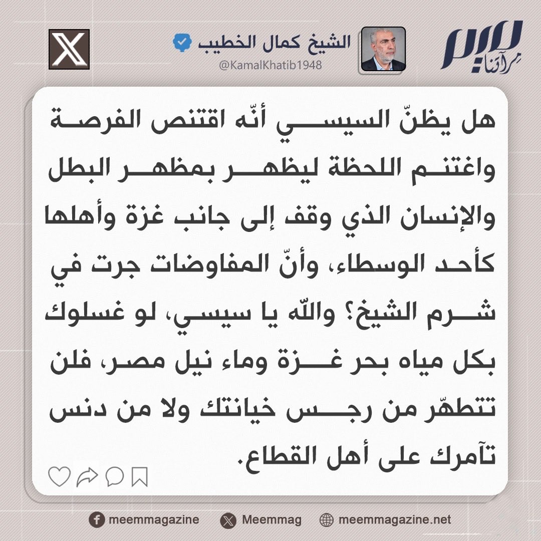 كمال الخطيب: والله يا سيسي، لو غسلوك بكل مياه بحر غزة وماء نيل مصر، فلن تتطهّر من رجس خيانتك ولا من دنس تآمرك على أهل القطاع.