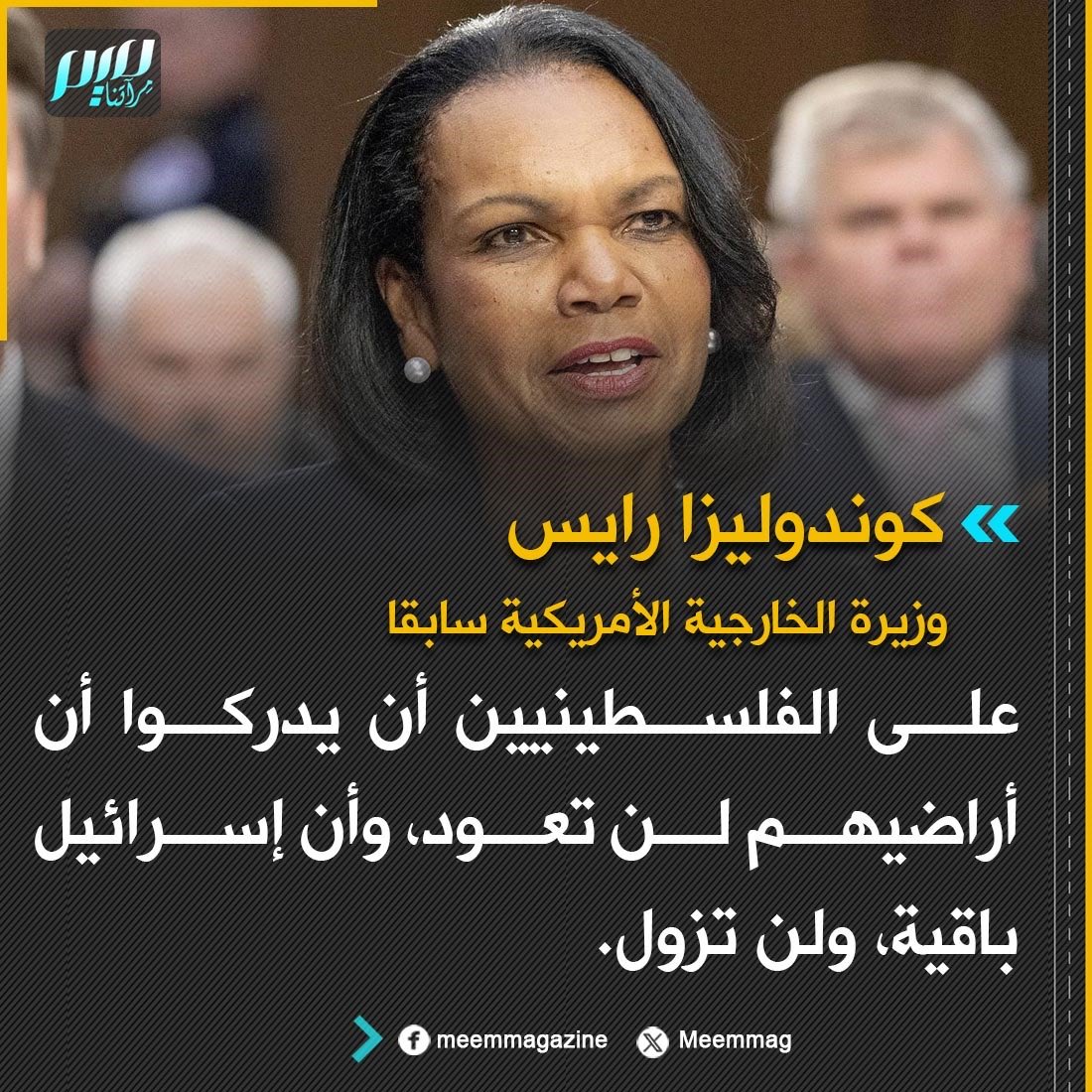 كوندوليزا رايس: على الفلسطينيين أن يدركوا أن أراضيهم لن تعود، وأن إسرائيل باقية، ولن تزول.