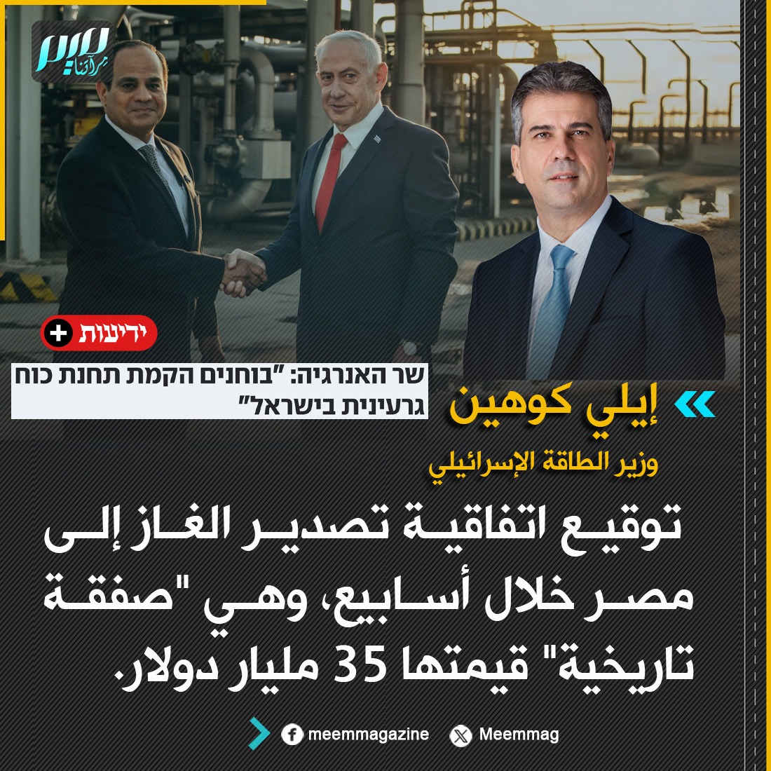 كوهين: توقيع اتفاقية تصدير الغاز إلى مصر خلال أسابيع، وهي "صفقة تاريخية" قيمتها 35 مليار دولار.