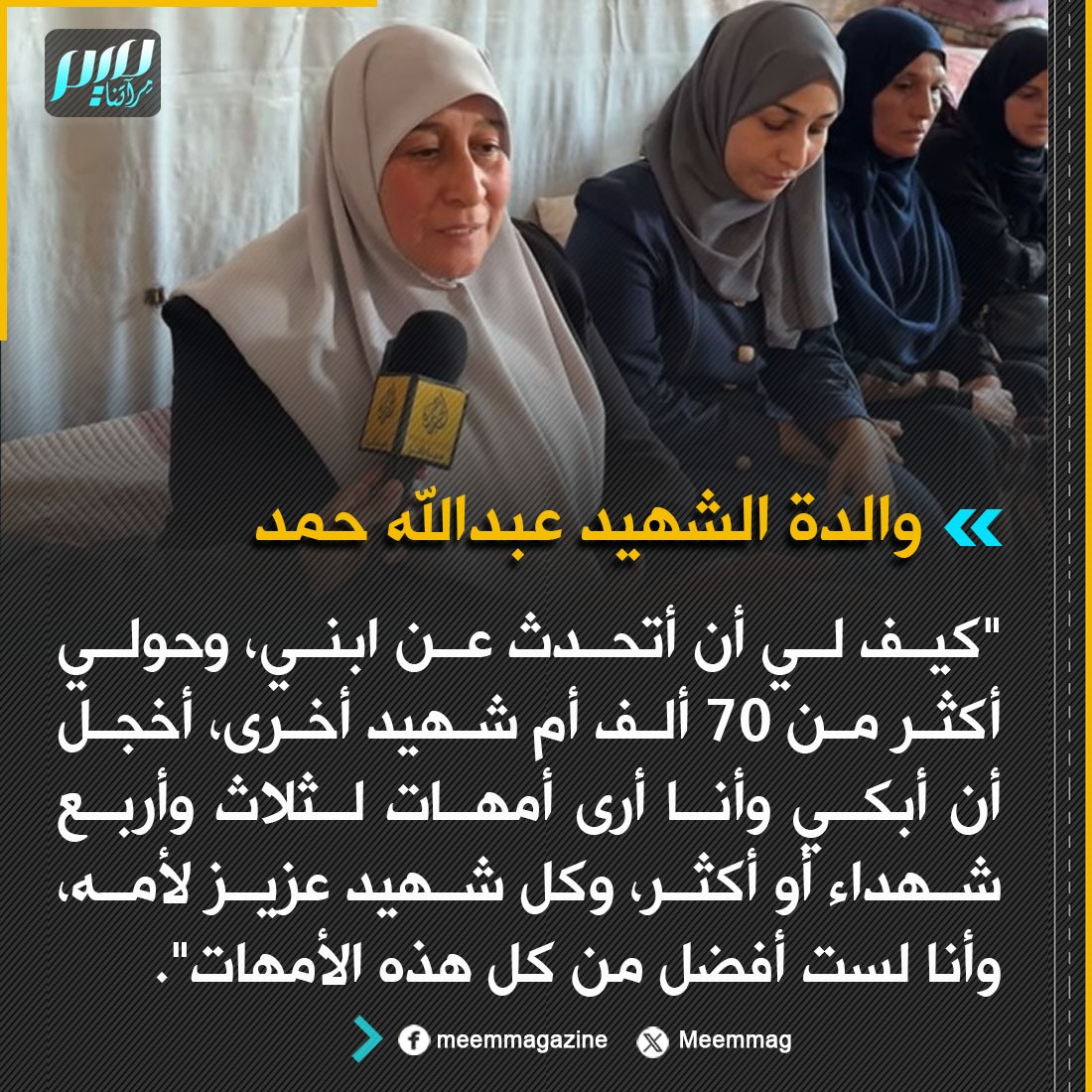 زوجة القيادي الفلسطيني غازي حمد، ترفض إجراء حوار تلفزيوني بصفتها والدة شهيد قضى في أنفاق رفح، وتقول لإحدى الصحفيات في بيت العزاء: "كيف لي أن أتحدث عن ابني الشهيد عبدالله، وحولي أكثر من 70 ألف أم شهيد أخرى، أخجل أن أبكي وأنا أرى أمهات لثلاث وأربع شهداء أو أكثر، وكل شهيد عزيز لأمه، وأنا لست أفضل من كل هذه الأمهات".
