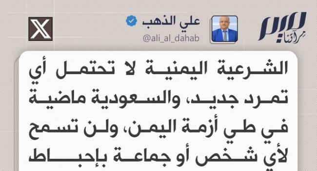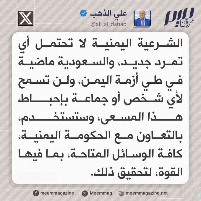 الخبير العسكري علي الذهب: السعودية ماضية في طي أزمة اليمن، وستستخدم بالتعاون مع الحكومة اليمنية، كافة الوسائل المتاحة، بما فيها القوة، لتحقيق ذلك.