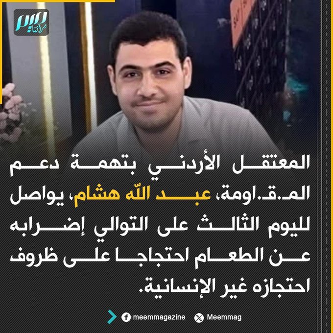 لليوم الثالث على التوالي، يواصل المعتقل الأردني بتهمة دعم المـ.قـ.اومة، المهندس عبد الله هشام، إضراب جوع احتجاجا على ظروف احتجازه غير الإنسانية.