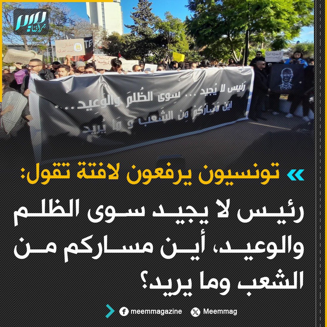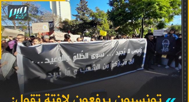 متظاهرون تونسيون يرفعون لافتة بالعاصمة تقول: رئيس لا يجيد سوى الظلم والوعيد، أين مساركم من الشعب وما يريد؟