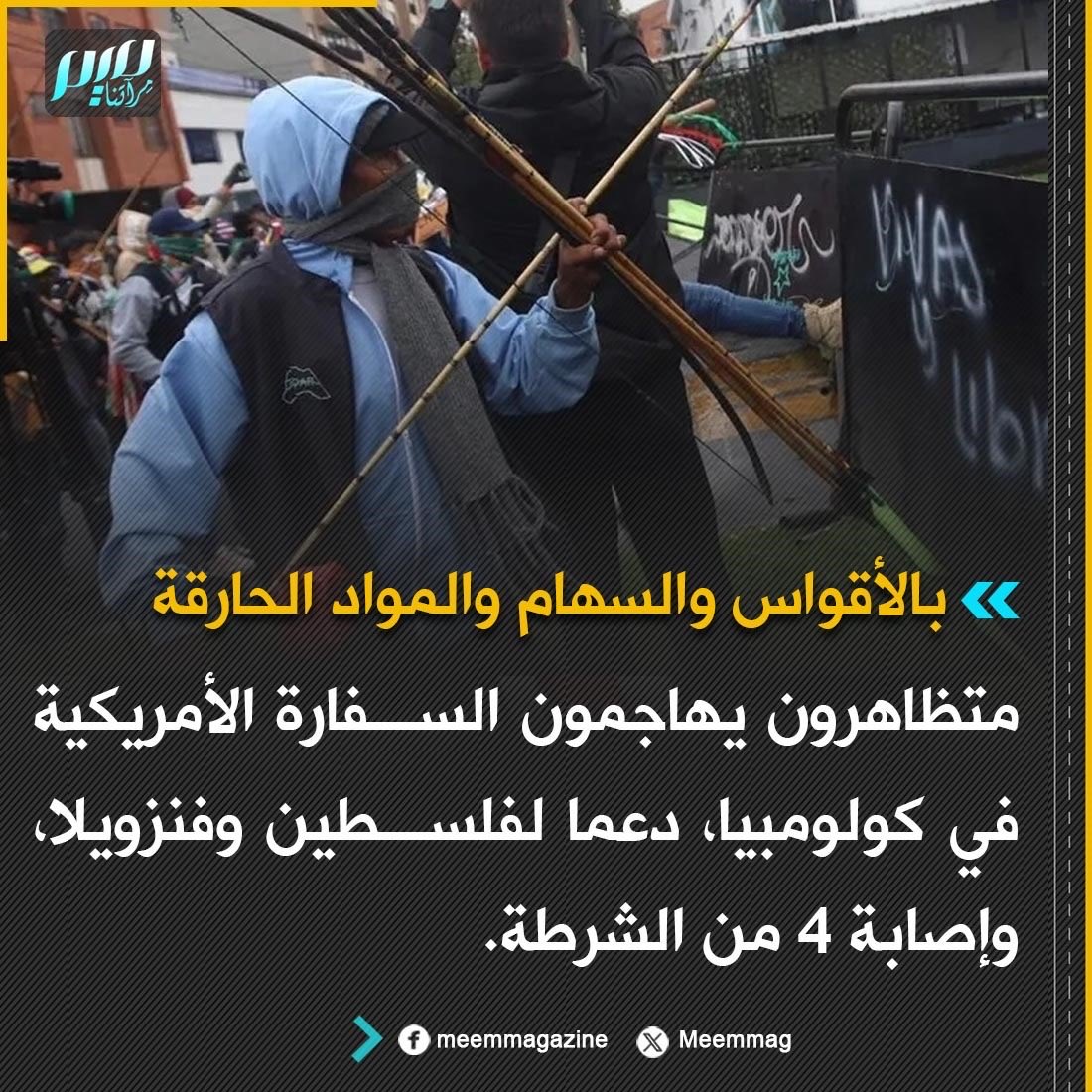 متظاهرون يهاجمون السفارة الأمريكية في كولومبيا، دعما لفلسطين وفنزويلا، وإصابة 4 من الشرطة.