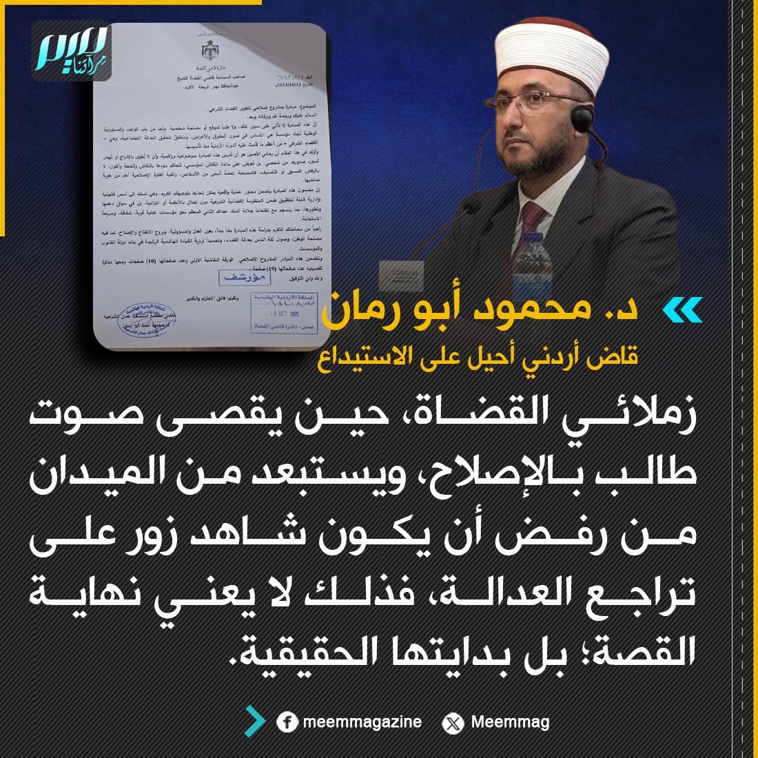 محمود أبو رمان، قاض أردني يحال للاستيداع لمطالبته بالإصلاح والتدقيق في تقرير "دائرة قاضي القضاة"، بحسب منشورات ووثائق يعرضها على حسابه في فيسبوك، أثارت ضجة على مواقع التواصل الاجتماعي.