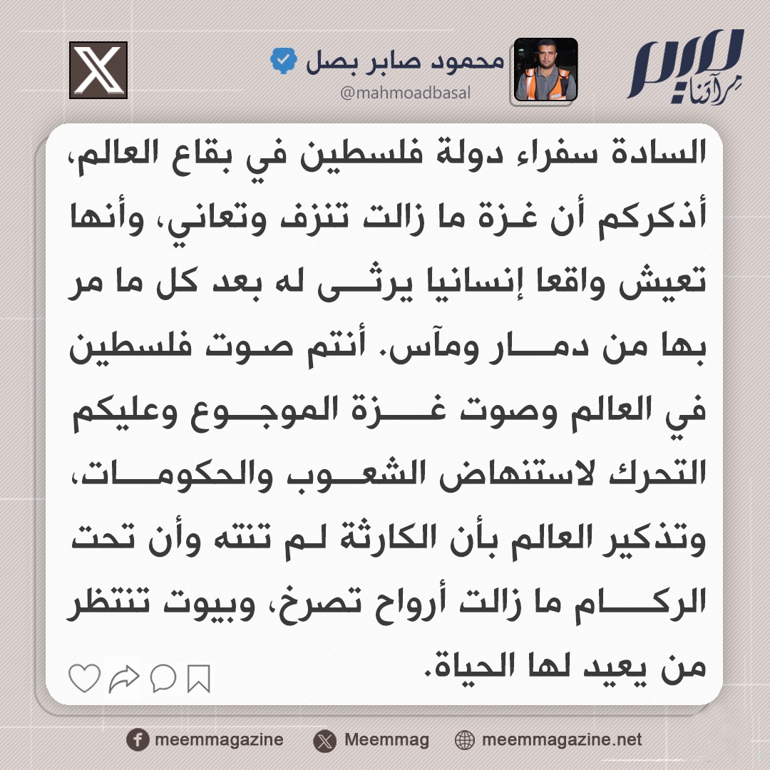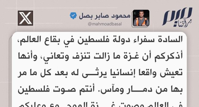 محمود بصل: السادة سفراء دولة فلسطين في بقاع العالم، أذكركم أن غزة ما زالت تنزف وتعاني، وأنها تعيش واقعا إنسانيا يرثى له بعد كل ما مر بها من دمار ومآس.