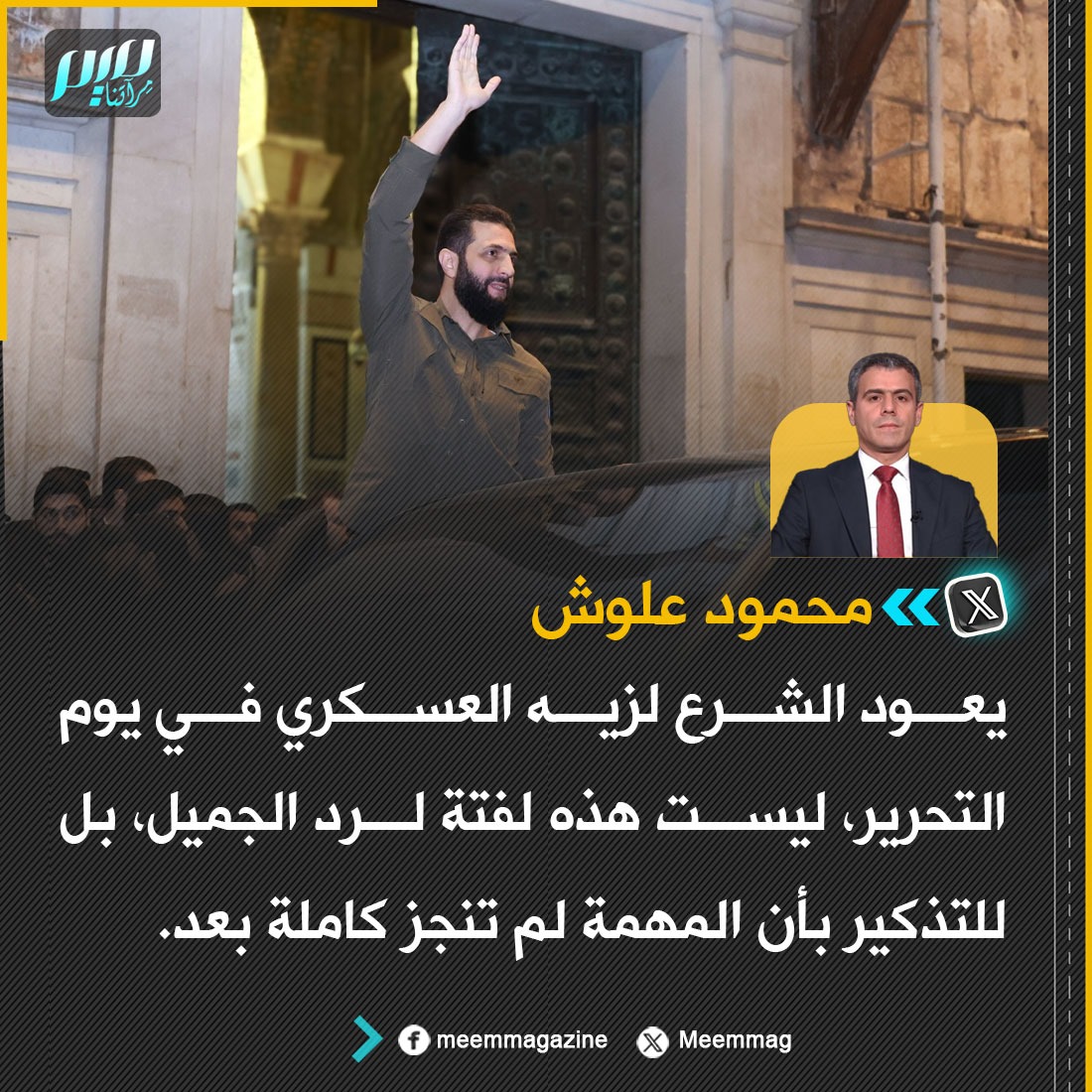 محمود علوش: يعود الشرع لزيه العسكري في يوم التحرير، ليست هذه لفتة لرد الجميل، بل للتذكير بأن المهمة لم تنجز كاملة بعد.