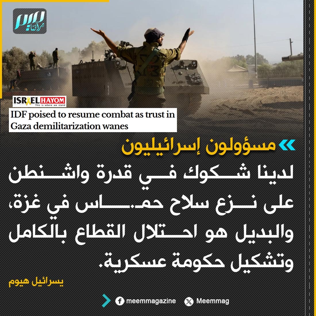 مسؤولون إسرائيليون: لدينا شكوك في قدرة واشنطن على نزع سلاح حمـ.ــاس في غزة، والبديل هو احتلال القطاع بالكامل وتشكيل حكومة عسكرية.